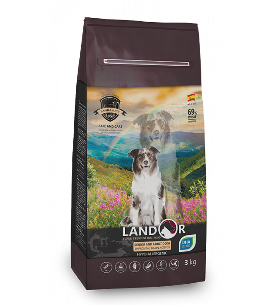 Повнораціонний сухий корм для дорослих та зрілих собак всіх порід з функцією покращення мозкової діяльності. Собаки віком від 7 років потребують годівлі спеціалізованими кормами, з включеннями в них біологічно активних добавок, що дозволяють профілактувати захворювання, що часто виникають в зрілому віці. До складу корму SENIOR ми вводимо продукт DHAgold®, що складається з морських водоростей, дуже багатих Омега-3 жирними кислотами і містить як мінімум 17% докозагексаєнової кислоти. Завдяки цьому, корм LANDOR DOG SENIOR & ADULT сприяє покращенню мозкової діяльності, стану шкіри та шерсті, знижує ризик виникнення алергії, уповільнює розвиток запальних процесів і оберігає суглоби від руйнування.